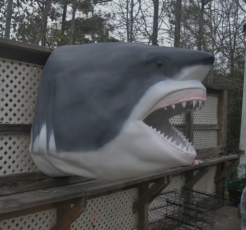 Cool and fierce! Perfect for huge impact at a low price. Cast from a real 18ft great white with lots of detail and two rows of cast teeth. Please allow up to 6 weeks for delivery. We can also paint as a Megalodon at same price- megalodon version comes w brass name plate. hanger on back to hang just like a picture- weighs approx 45lbs.